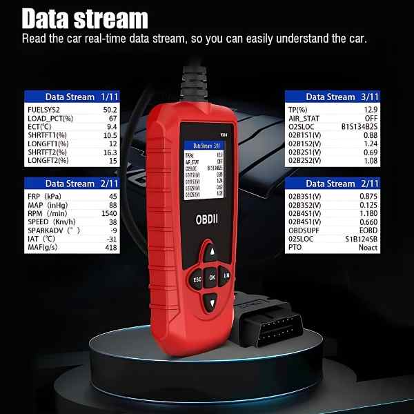 - عرض بيانات الحساسات في الوقت الفعلي: يتيح لك الجهاز مراقبة أداء سيارتك عن كثب من خلال عرض بيانات حية من مختلف الحساسات، مثل: