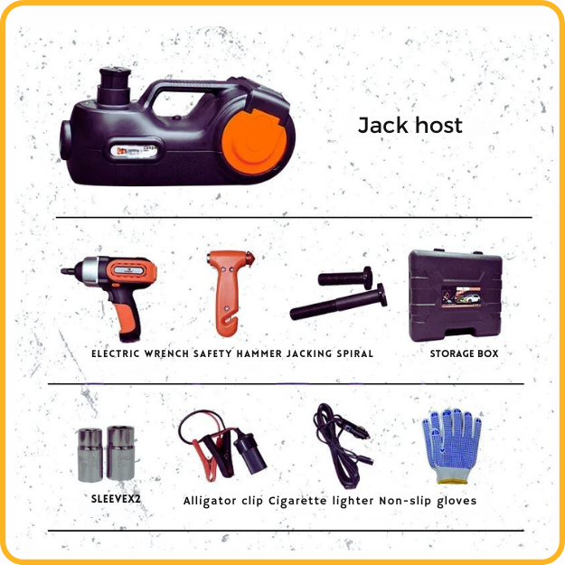 - تشمل مجموعة رافعة سيارة كهربائية مفتاح ربط كهربائي، منفاخ هواء للإطارات، مطرقة أمان، وصندوق معدات بلاستيكي، مما يوفر لك كل ما تحتاجه لعمليات الصيانة.