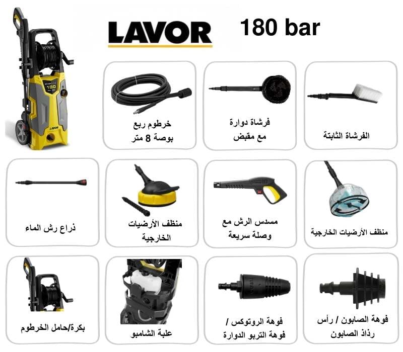 نقدم لك في متجر لمسات سيارتي الحل الإيطالي ذو الجودة العالمية: مضخة غسيل لافور (Lavor). بضغطها الهائل الذي يصل إلى 180 بار وقوة محرك 2500 واط، تضمن لك هذه الماكينة التخلص من أصعب الأوساخ والوصول إلى الأماكن التي يصعب تنظيفها، لتحقيق نظافة ورونق دائم لسيارتك ومنزلك. وهي مثالية للاستخدام المتكرر والتنظيف العميق للأوساخ المستعصية.