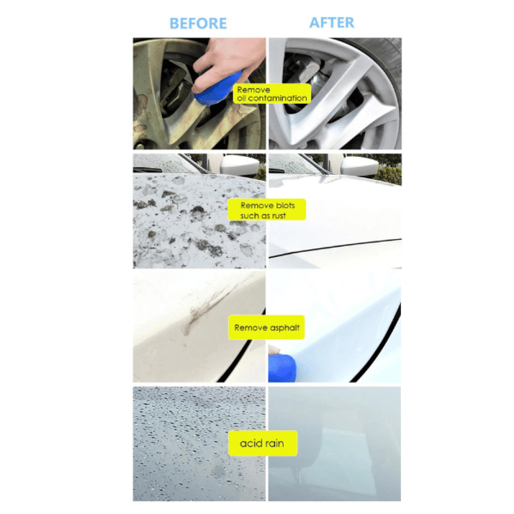- إزالة الشوائب و الخشونة: يزيل بفعالية الأوساخ، والبقع السوداء، والبقع المؤكسدة، وفضلات الحيوانات، و رواسب الحديد، والمطر الحمضي، وبقايا الصيانة الخاطئة، دون إلحاق الضرر بطلاء السيارة.
